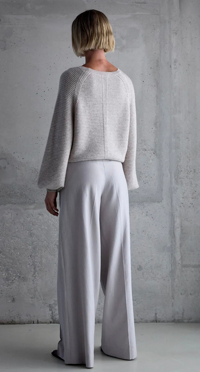 Een heerlijk zachte trui gemaakt van wol met cashmere, met een subtiele lurex draad in de ballon mouwen. Met een ronde kraag, een board en brede manchetten is het een echte eye catcher