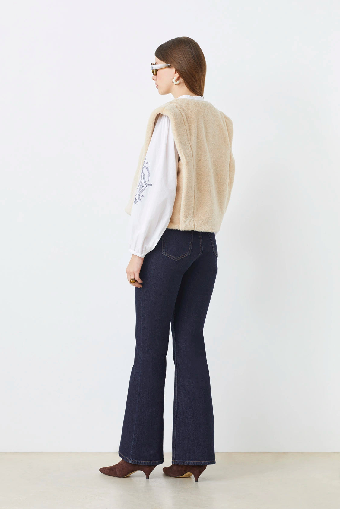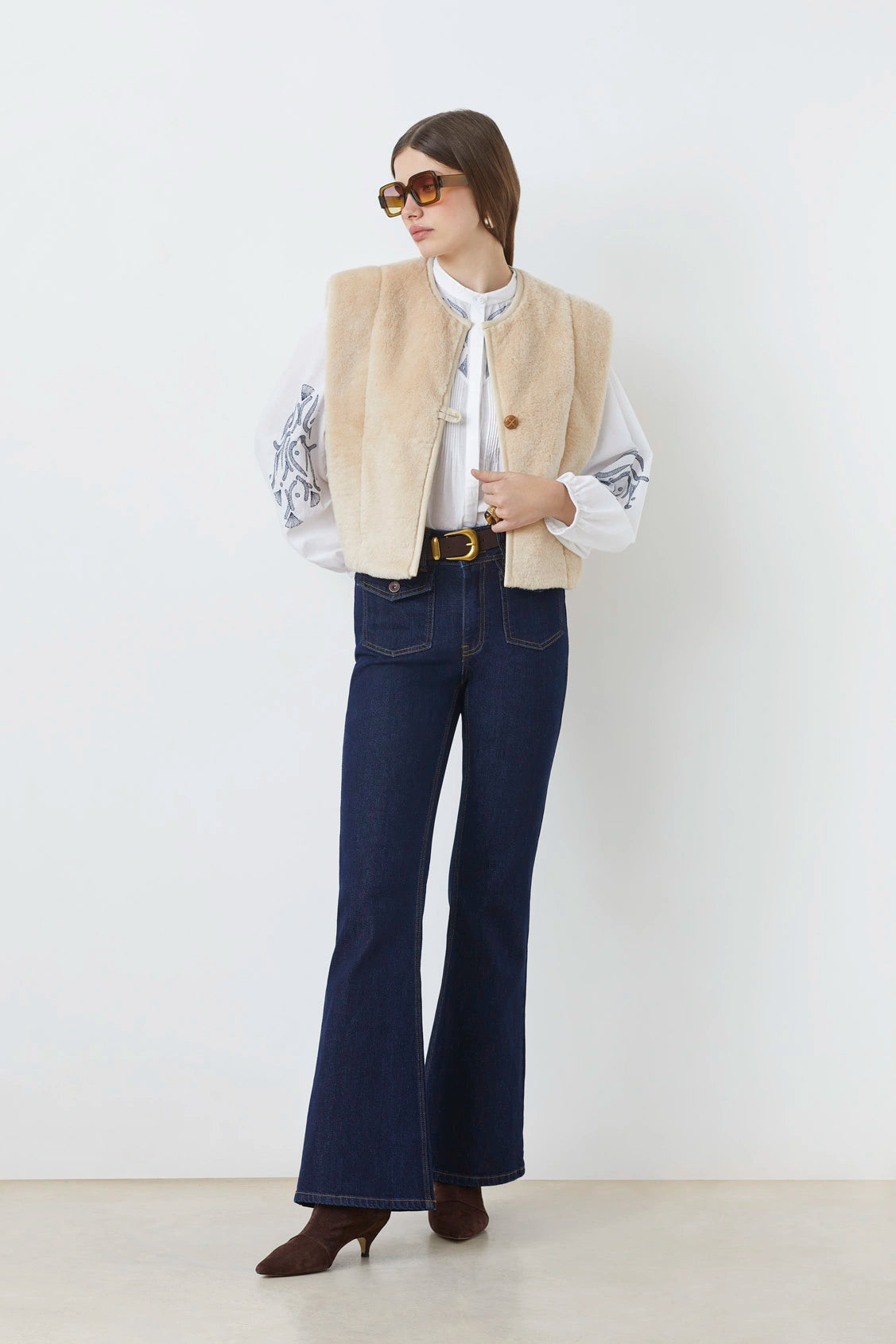 -Toon-op-toon beige bies langs de kraag en langs de knoopsluiting